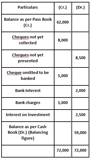 for payment amounted to ₹ 72,000. Dividend of ₹ 5,000 was received by the bank but not entered in the cash book.