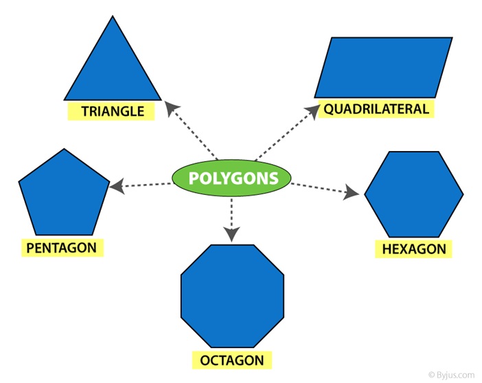triangles (having 3 line segments), quadrilaterals (having 4 line segments), pentagon (having 5 line segments),