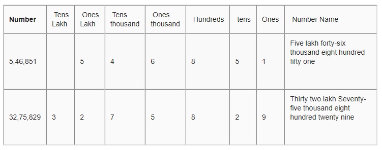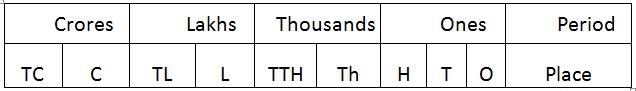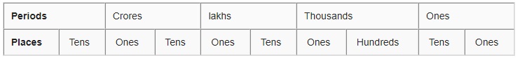 Values of the places in the Indian system of numeration are Ones, Tens, Hundreds, Thousands, Ten thousand, Lakhs,