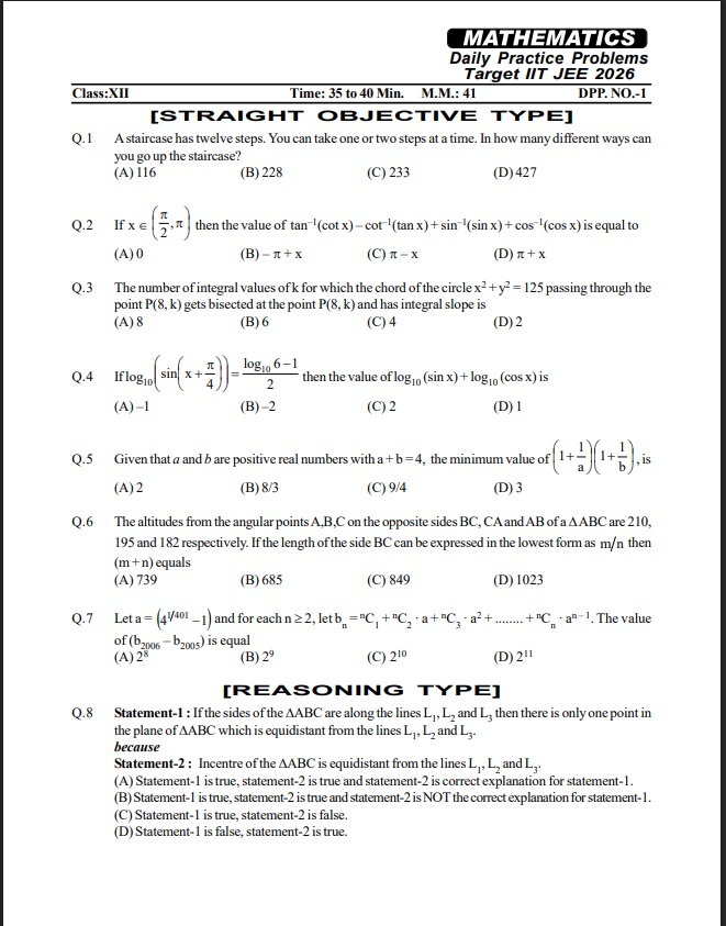IIT JEE MATHEMATICS 12TH CLASS DPPS CONTAIN TOTAL 99 DPPS WITH PROPER ANSWER